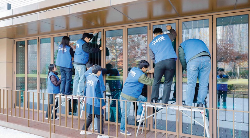 구해조(鳥) KCC글라스 캠페인 참여자들이 조류충돌방지스티커 부착 활동을 진행하고 있다